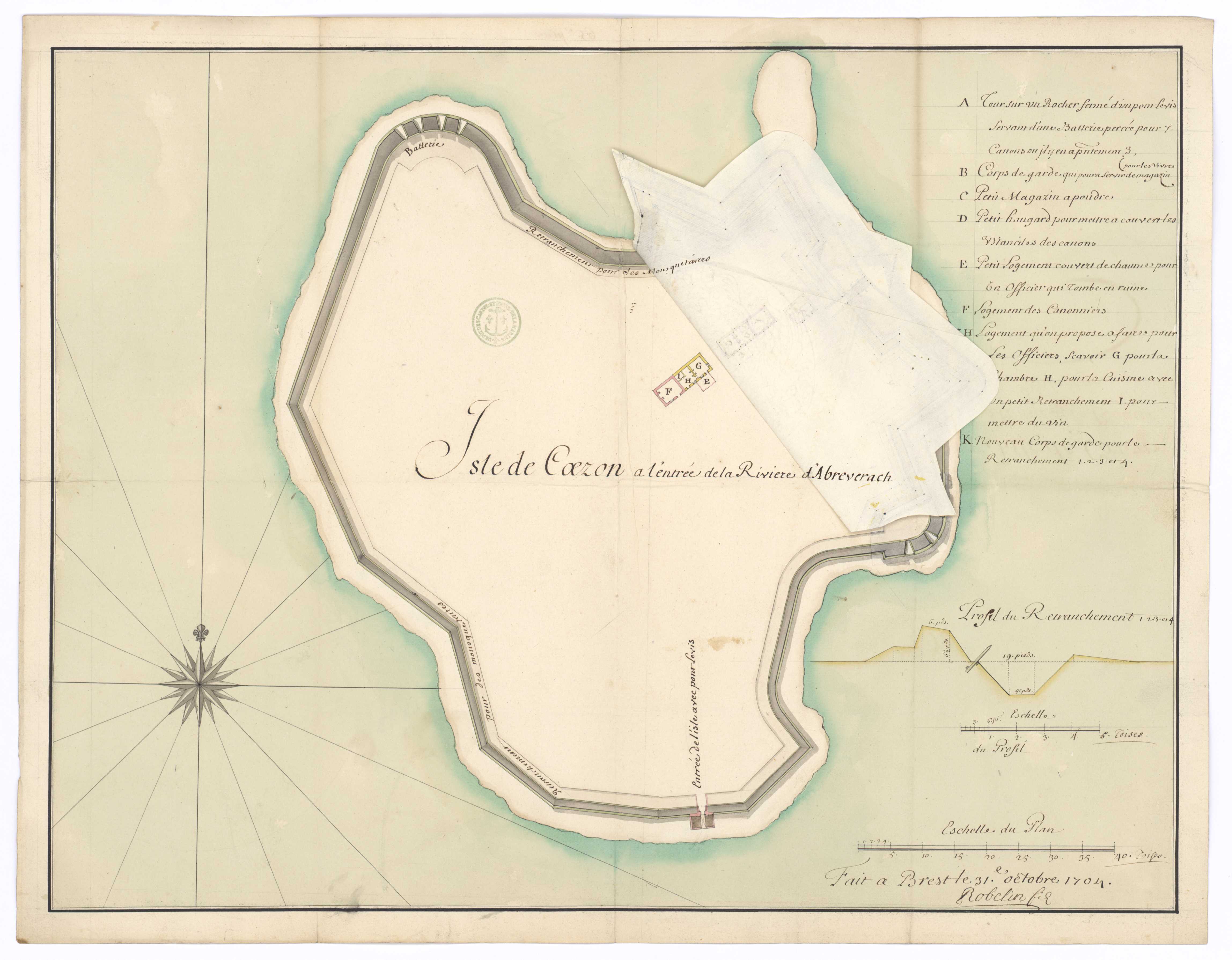 Collection Nivart. MS144_226. Rivière d'Aber-Wrac´h. Ile de Cézon. Plan de l'île et de ses retranchements avec projet de transformation. Profil du nouveau retranchement. Sign. Robelin fis. 31 octobre 1704. Plan, support papier, 0,572 x 0,441 mètre, 1er quart 18e siècle, 31 octobre 1704.