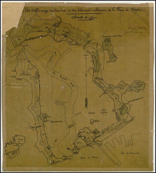 Plan de la ville et des fortifications de Brest : terrains et bâtiments militaires (champ de manoeuvre du Stiff, Quéliverzan, fronts du Bouguen, porte de Kerinou, ouvrage de la carrière du Pape, caserne et porte Fautras, Keroriou), affermage, 1922Immatriculation