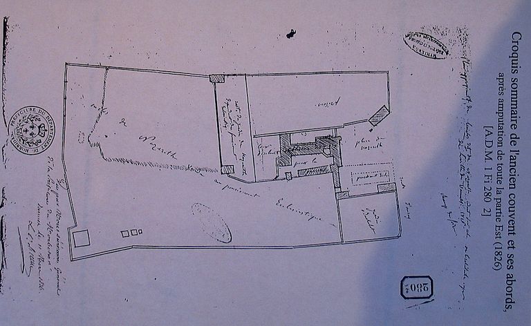 Croquis sommaire de l'ancien couvent et ses abords après amputation de toute la partie est, 1826. AD Morbihan 1Fi280/2.Immatriculation