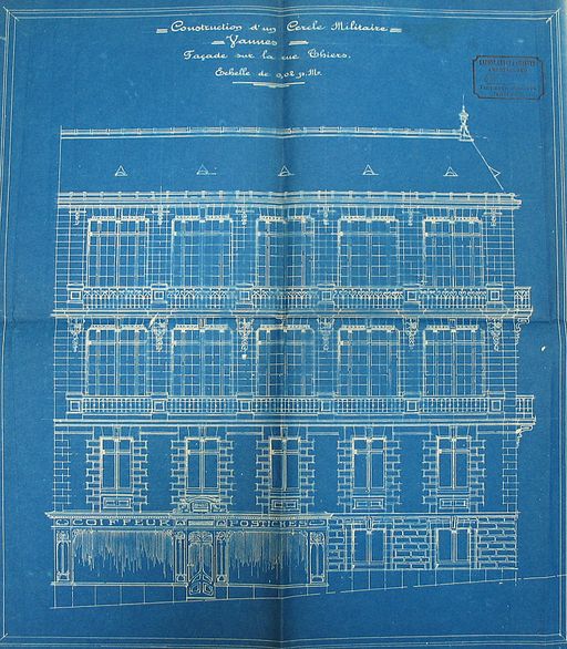 Construction d'un cercle militaire : façade sur la rue Thiers par Lafont, 1910. AM Vannes 5I162.Immatriculation