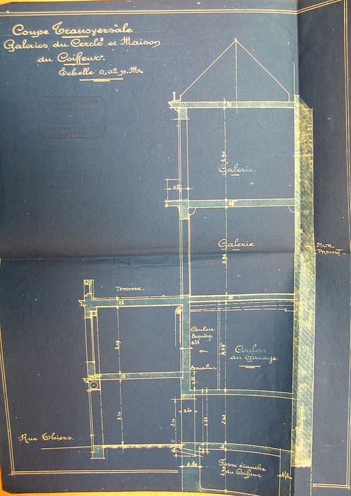 Galeries du cercle militaire et de la maison de coiffeur : coupe transversale par Lafont, 1910. AM Vannes 5I162.Immatriculation