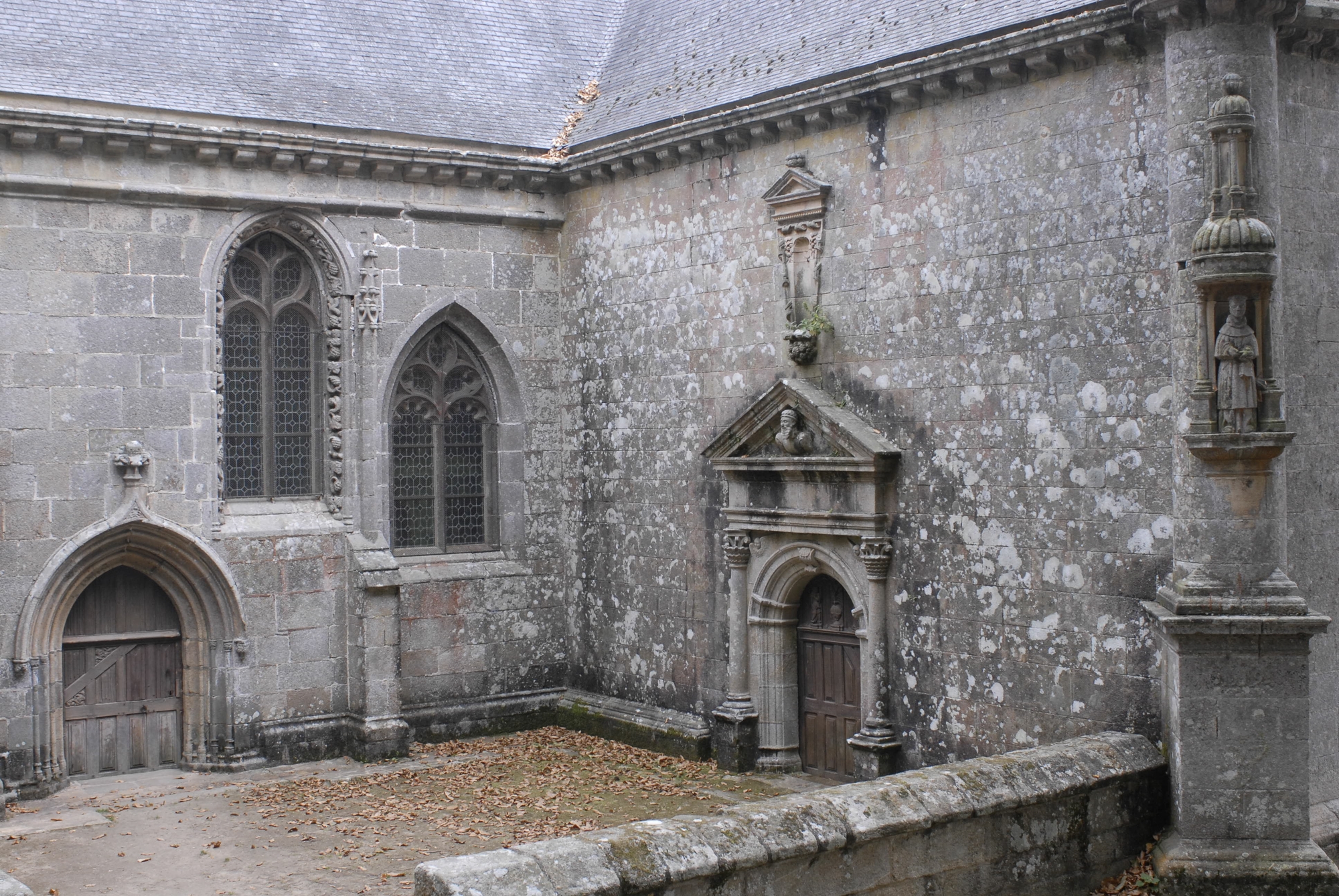 Ploubezre, chapelle de Kerfons : élévations sud. Le contraste est saisissant entre le Gothique flamboyant de la nef, vraisemblablement datable de la fin du 14e siècle ou du début du 15e siècle et la première Renaissance bretonne visible dans le bras sud (chapelle dédiée à Saint-Yves) datée des années 1553-1559Immatriculation