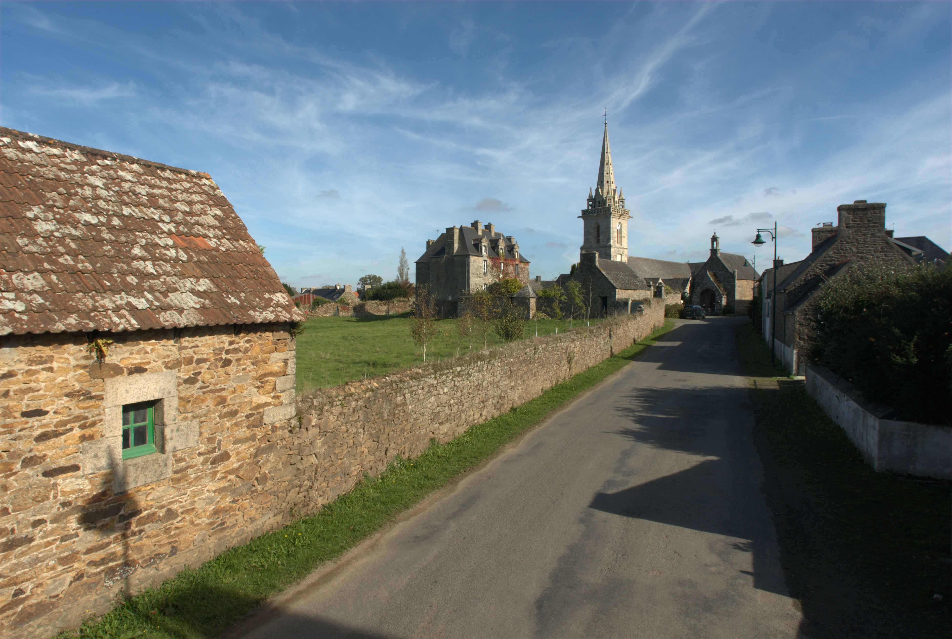 Plufur, le bourg, rue Joliot-Curie : vue de situation depuis le sud-ouest. On distingue l'église paroissiale dédiée à Saint-Florent, le presbytère et la chapelle Saint-YvesImmatriculation