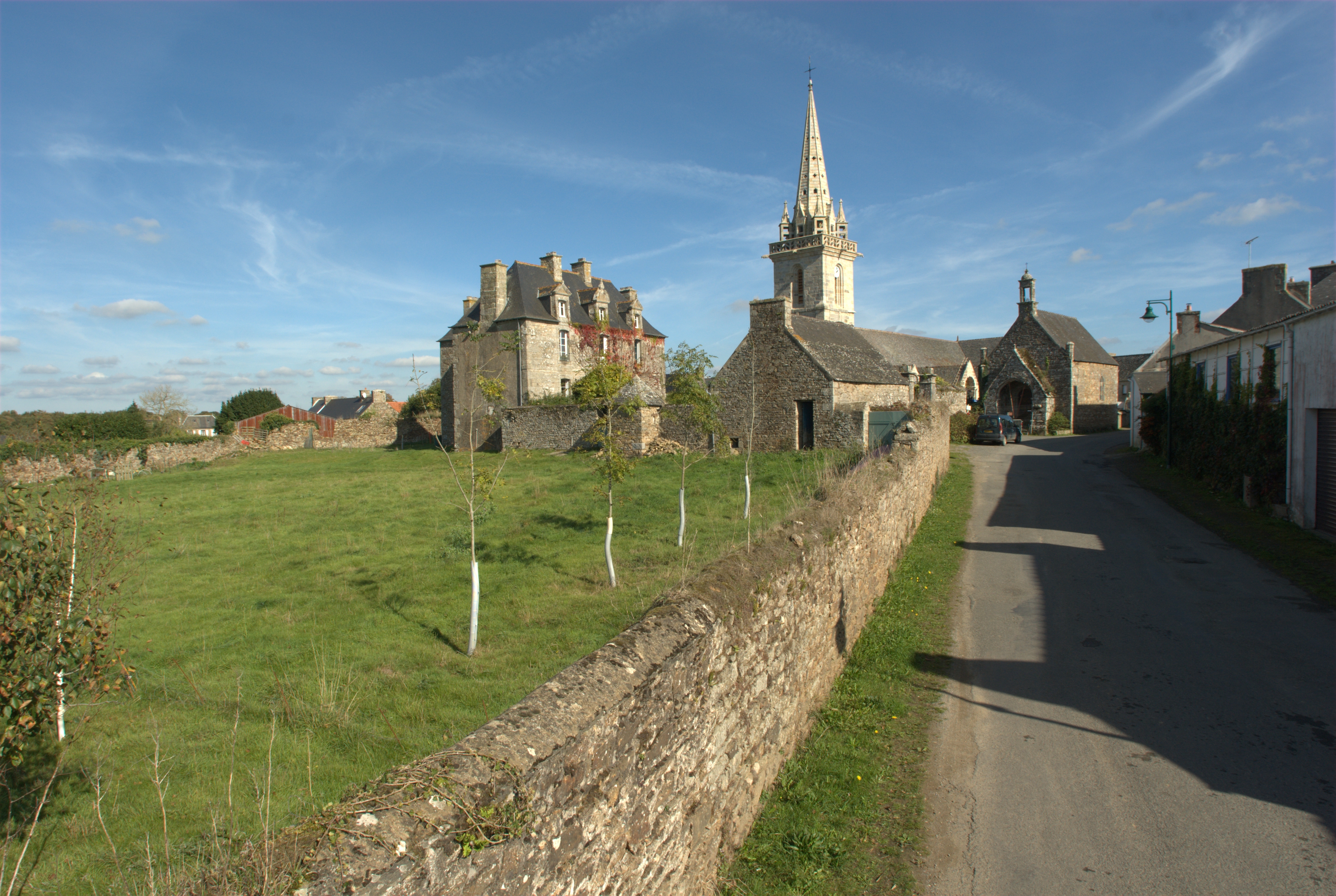 Plufur, le bourg, rue Joliot-Curie : vue de situation depuis le sud-ouest. On distingue l'église paroissiale dédiée à Saint-Florent, le presbytère et la chapelle Saint-YvesImmatriculation