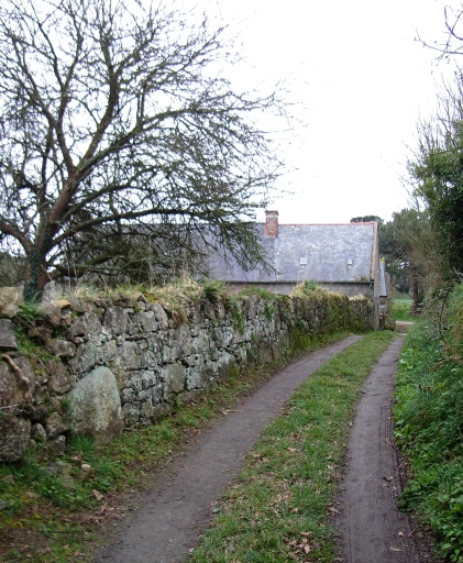 Kerbors, le Rohel (limite Kerbors-Pleubian). Image de la ruralité et d'une campagne encore préservée : chemin carrossable et mur de clôture constitué de gros blocs de graniteImmatriculation