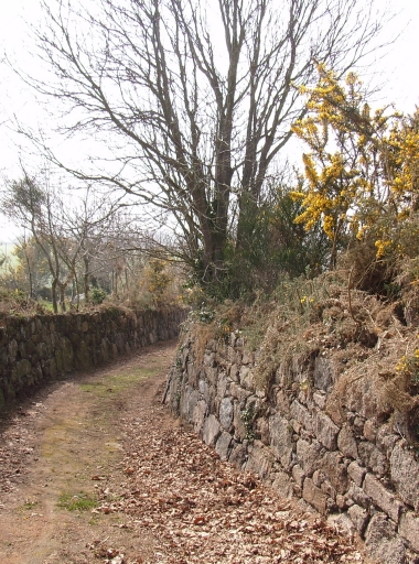 Lanmodez, Keraniou. Image de la ruralité et d'une campagne encore préservée : chemin carrossable et talus-mur constitué de gros blocs de granite accueillant une végétation spécifique diversifiéeImmatriculation