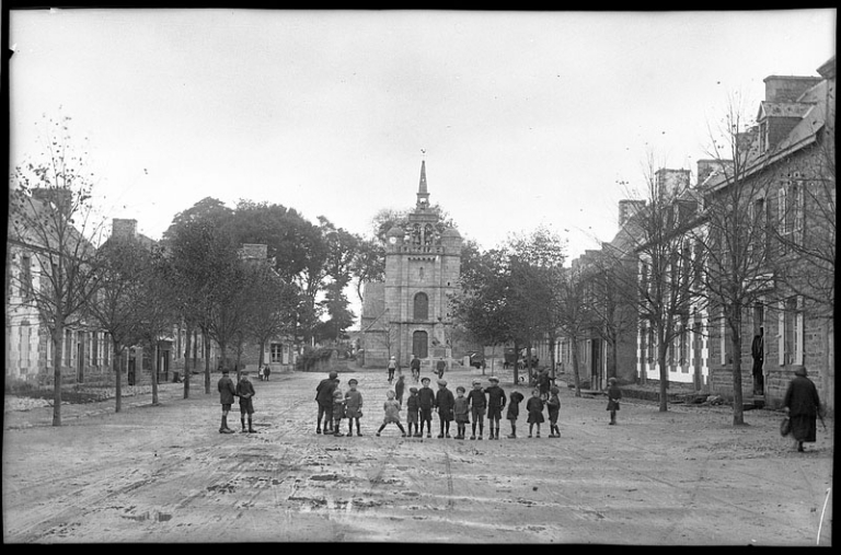 Vue générale du bourg : la place de l'église depuis l'ouest, photographie noir et blanc par Lacombe, 2ème quart du 20ème siècle (AD 22, fonds Lacombe)Immatriculation