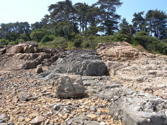 Vue des filons de dolérite au niveau du massif rocheux qui entoure l'îleImmatriculation