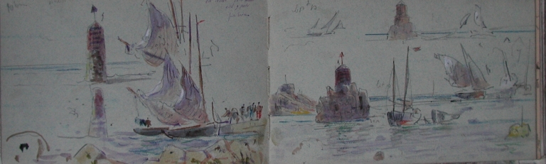 Dessin aquarellé de Faudacq : balises à l'embouchure de l'estuaire du Trieux, 3ème quart 19ème siècle (collection particulière)Immatriculation
