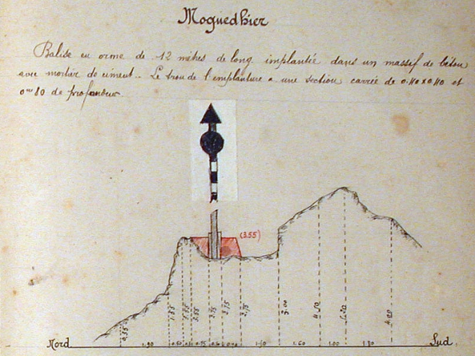 Dessin aquarellé de la perche 'Moguedhier', mise en place pour la 1ère fois en 1901 pour baliser l'entrée de la baie de Pommelin, 3ème quart 20ème siècle (DDE 22, Service des Phares et Balises)Immatriculation