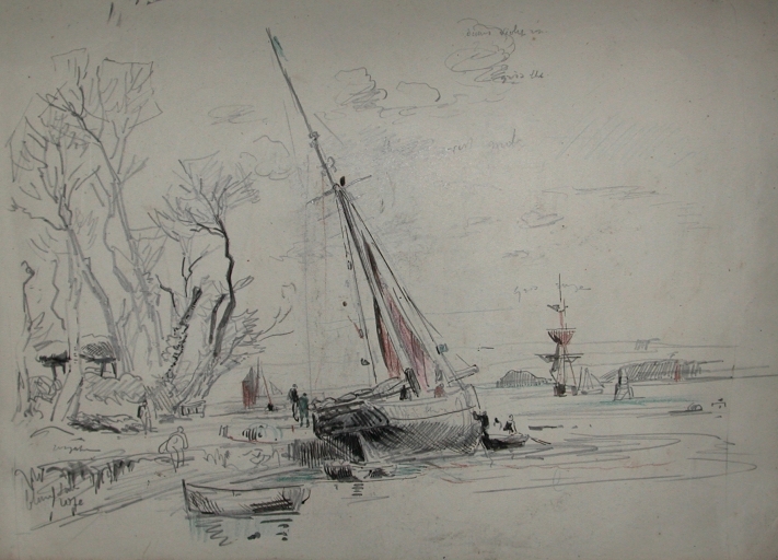 Dessin aquarellé de Faudacq : échouage d'un caboteur au niveau des anciens quais, fin 19ème siècle (collection particulière)Immatriculation