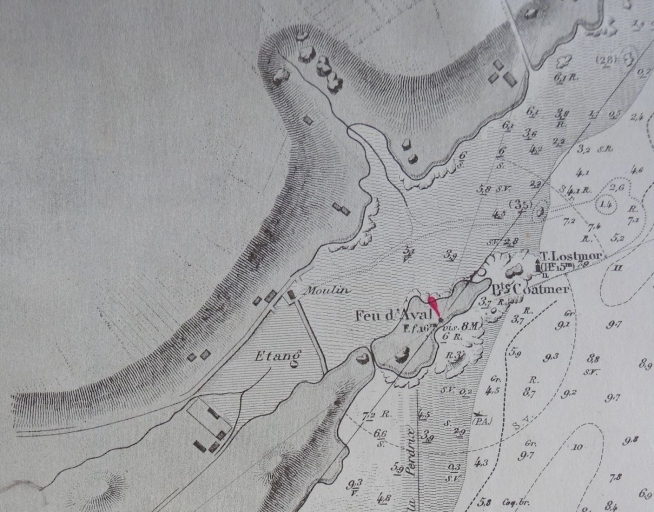 Extrait du plan de la rivière de Pontrieux, levé en 1868 : le site du Moulin Mer près de Coatmer aval (EPSHOM)Immatriculation