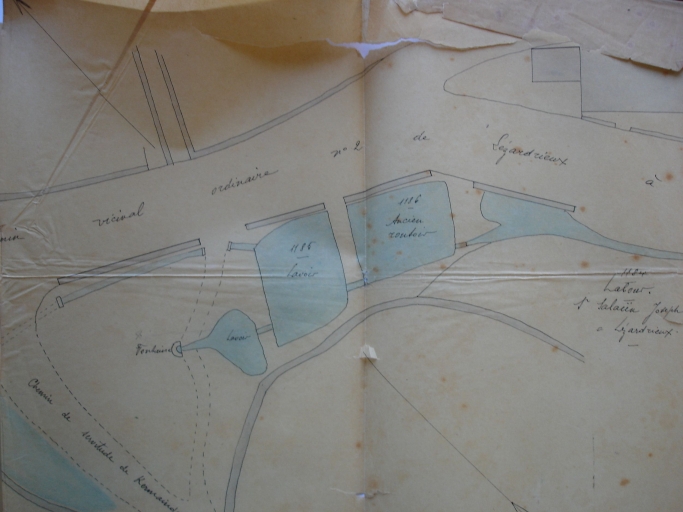Plan du site avec le circuit de l'eau et les édicules en 1891 : lavoir, routoir et fontaine (AD 22)Immatriculation