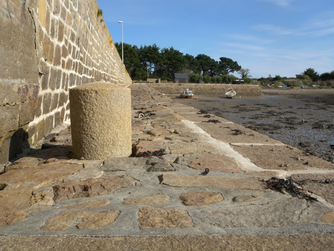 Vue d'un bollard ou borne d'amarrage à l'extrémité de la caleImmatriculation