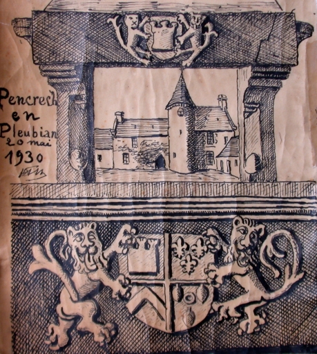 Pen-Crec'h, vue générale du manoir, croquis à la plume d'Henri Frotier de la Messelière, 20 mai 1930 (AD 22)Immatriculation