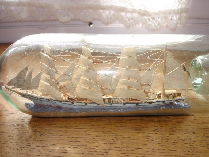 Maquette de bateau en bouteille : quatre mâts barque long courrier,