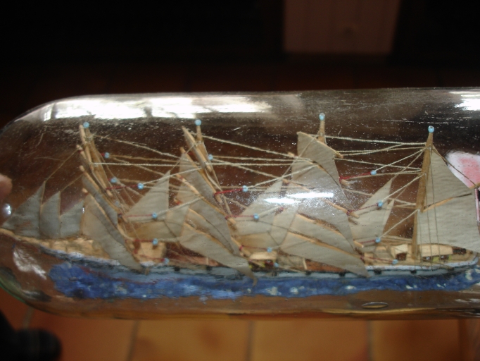 Maquette de bateau en bouteille : quatre mâts barque long courrier,