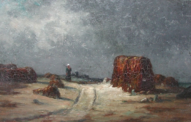 Tableau, huile sur bois : meules de goémon et femme en coiffe traditionnelle au Sillon de Talbert, 4ème quart 19ème siècle (Faudacq, collection particulière)Immatriculation
