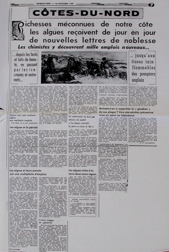 Extrait du journal 'Ouest-France', 24 novembre 1959 : la richesse des algues (collection particulière)Immatriculation