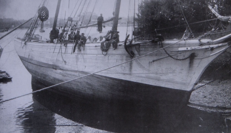 Le dundee 'Iris' à l'échouage à Saint Servan, avec son équipage de 4 hommes, dont Eléazar Meudal, 1er quart 20ème siècle (collection particulière)Immatriculation