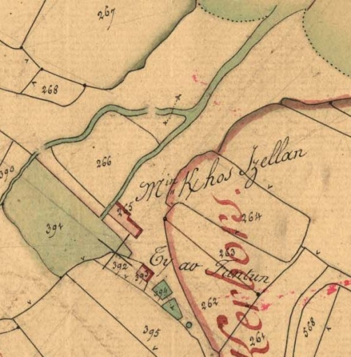 Extrait du cadastre de 1829 : le moulin à eau de Milin Koz Izellan : D1ère feuille 265 (AD 22)Immatriculation