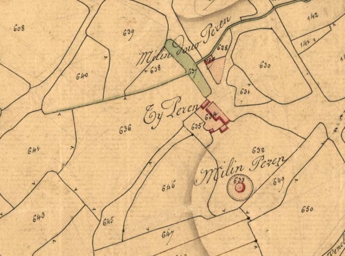 Extrait du cadastre de 1829 : le moulin à vent de Pezen : D1ère feuille 633 (AD 22)Immatriculation