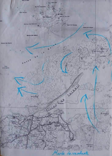 Schéma, d'après carte IGN : direction du courant et marée descendante au Sillon de Talbert, 4ème quart 20ème siècle, d'après carte IGN (CPIE du Trégor, 1990, collection particulière)Immatriculation