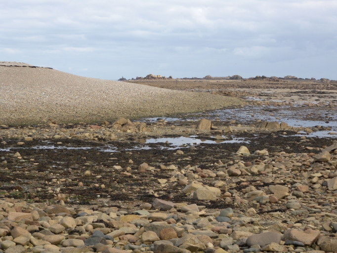 Vue du bout du Sillon de Talbert : le cordon de galets s'affaissent au niveau de son crochet terminal, avec le passage de 'Toull Sten'Immatriculation