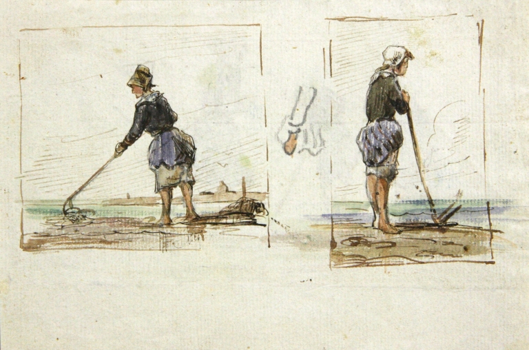 Dessin aquarellé : femmes récoltant le goémon d'épave, avec un croc, 4ème quart 19ème siècle (Faudacq, collection particulière)Immatriculation