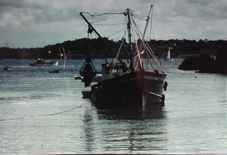 Vue de la 'Mylène', équipée de deux dragues ou crapauds sur vergues pour lever et brasser sables et graviers dans la 'Chambre' à Bréhat, vers 1980 (collection particulière)Immatriculation