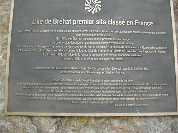 Vue de la plaque inaugurale du classement de Bréhat comme premier site classé en France, en 1907Immatriculation