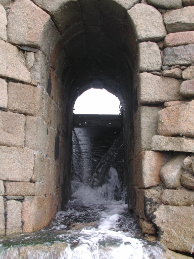 Vue générale du pertuis en arche permettant à l'eau de l'étang de s'échapper à marée descendanteImmatriculation