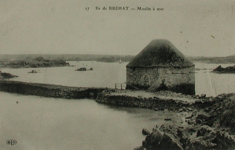 Vue de l'ancien moulin à marée en fonctionnement avec son toit en chaume, 1er quart 20ème siècle (carte postale, collection particulière)Immatriculation