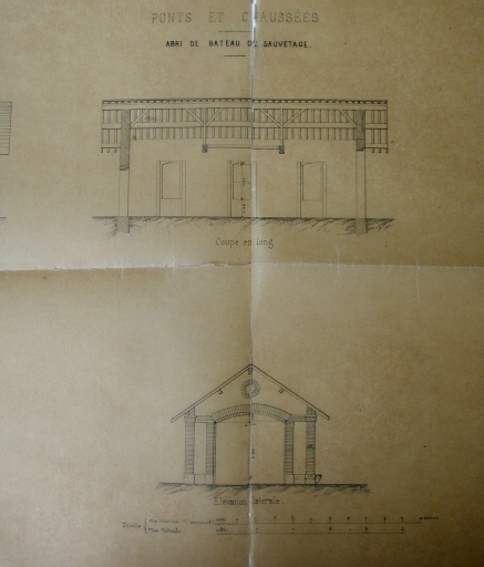 Coupe en long et élévation de l'abri de sauvetage, par l'ingénieur Pelaud, 1868 (AD 22)Immatriculation