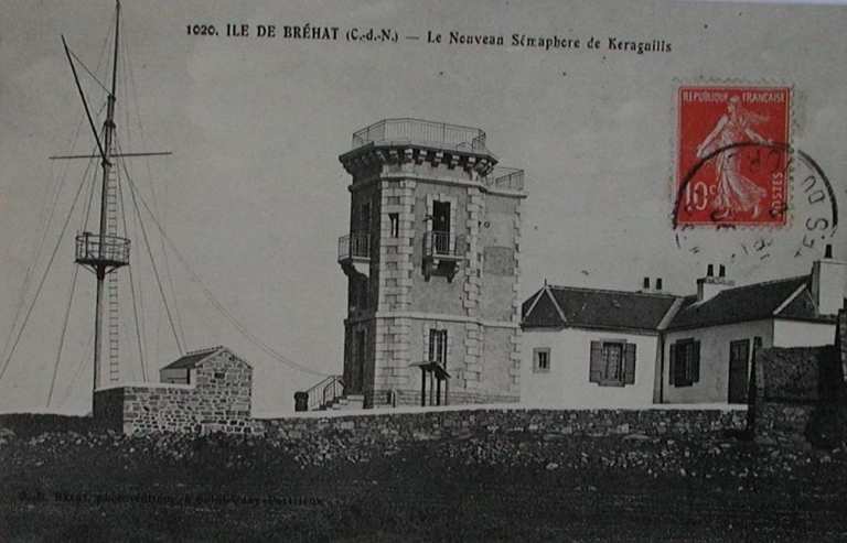 Vue du sémaphore de Keranguilis avec son mât sémaphorique et sa nouvelle tour, 2ème quart 20ème siècle (carte postale, collection particulière)Immatriculation