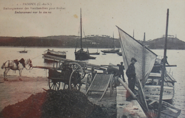 Embarquement des marchandises pour Bréhat, 1er quart 20ème siècle : remarquer le tas de goémon (carte postale, collection particulière)Immatriculation