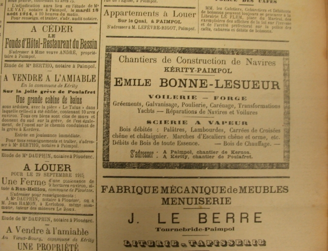 Publicité pour le chantier naval Bonne-Lesueur dans le 'Journal de Paimpol', 1914 (archives 'Presse d'Armor', collection particulière)Immatriculation