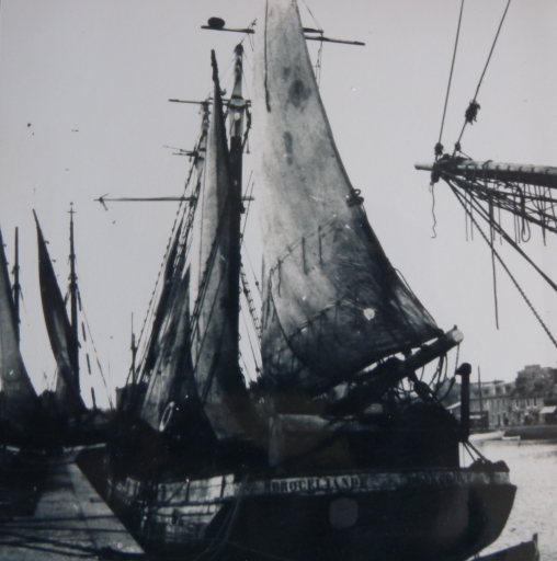 Vue de l'ancienne goélette 'Brocéliande', transformée en caboteur, mâts tronqués, 2ème quart 20ème siècle (collection particulière)Immatriculation