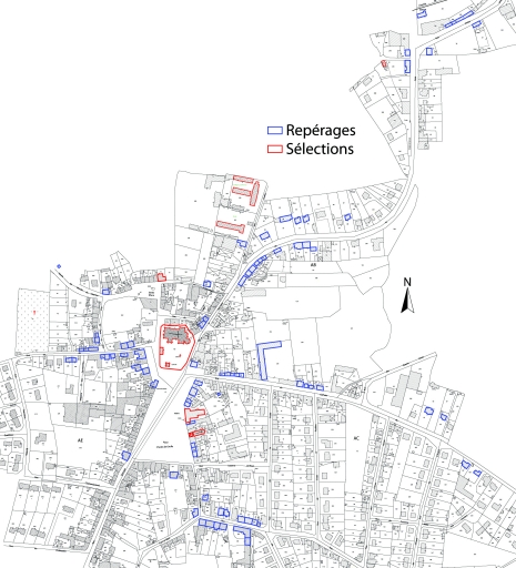 Localisation des éléments sélectionnés et repérés sur le cadastre actuel (assemblage des sections A B, A C, A D et A E)Immatriculation