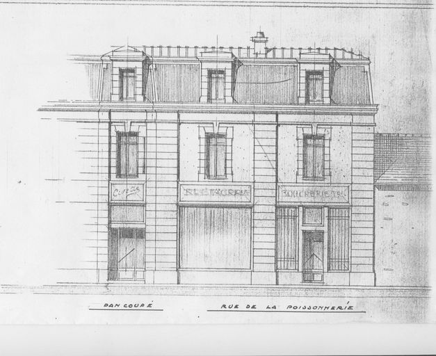 Projet de maison pour monsieur Scélo : façade sur la ruelle de la Poissonnerie, par Gemain, vers 1926. AM Vannes 1D2.Immatriculation
