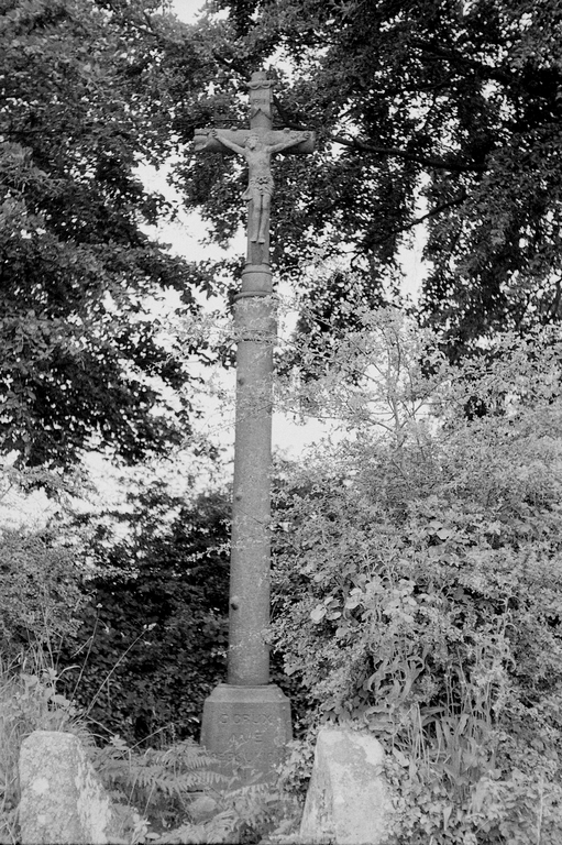 Saint-Eloi, croisement de la route Plouaret-Bégard et Pluzunet-Trégrom : croix de mission datée de 1888 et signée Y. HERNOT, photographie de 1972. Elle porte l'inscription suivante : FRANCOIS MORVAN CHARLOTTE LE NORMANDImmatriculation