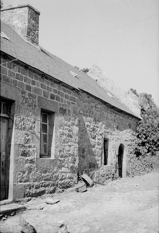Trégrom, Poulgouénan : alignement de 2 logis (le premier datant de la fin du 19e siècle ou du début du 20e siècle ; le deuxième à porte en plein-cintre pouvant remonter au 17e siècle), photographie de 1972Immatriculation