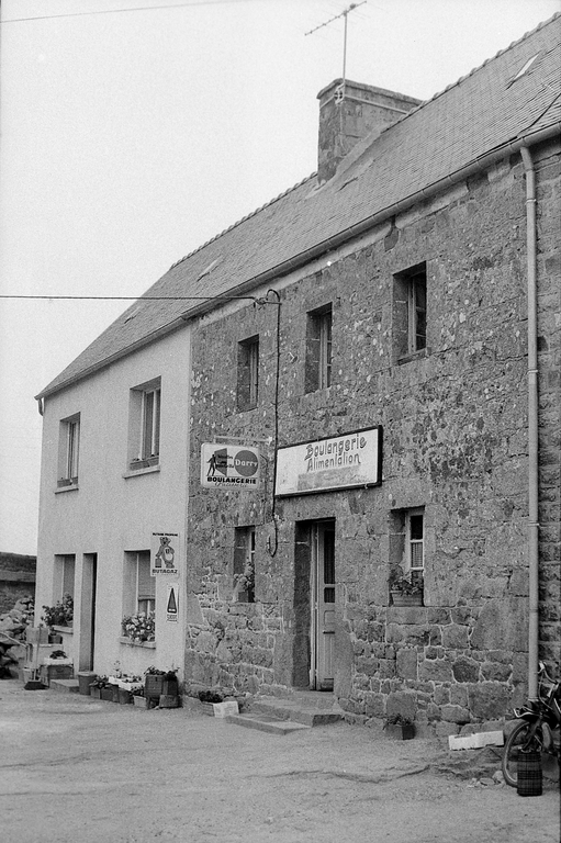 Trégrom, le bourg, ancienne boulangerie : maison à étage à 3 travées datée par chronogramme de 1843, photographie de 1972. L'édifice a été remanié par la suite, de grandes fenêtres venant remplacer les originellesImmatriculation