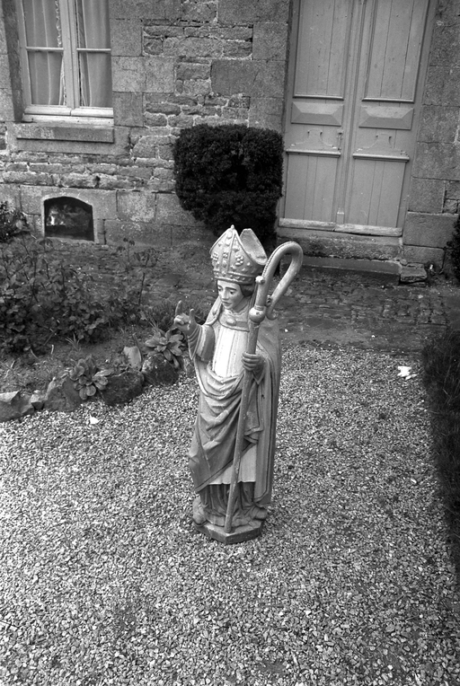 Lanvellec, le bourg, 1 place de l'église : presbytère puis maison, statue, photographie de 1974Immatriculation