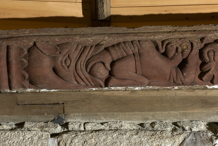 Plougras, le bourg : vue intérieure de l'église paroissiale Saint-Pierre, nef, sablière sculptéeImmatriculation