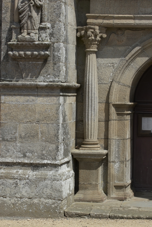Loguivy-Plougras, le bourg : église paroissiale Saint-Emilion, vue de détail de la facade ouestImmatriculation