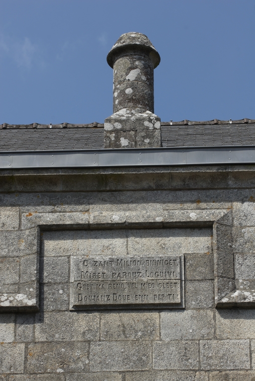 Loguivy-Plougras, le bourg : église paroissiale Saint-Emilion, vue de détail de l'inscription de la sacristieImmatriculation