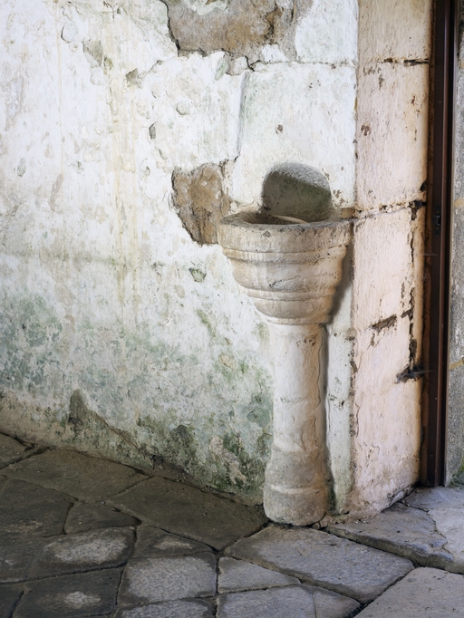 Plounérin : chapelle de la Clarté, vue du bénitier sur le mur ouestImmatriculation