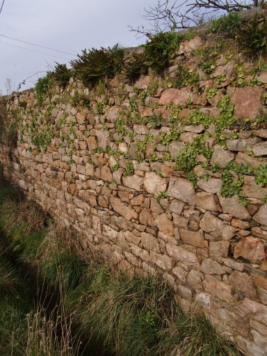Paimpol, témoignage d'un savoir-faire architectural : haut mur de clôture à chaperon à deux versants contruit en moellons de granite, schiste et grès, recevant une végétation spécifique (nombril-de-Vénus et fougère)Immatriculation
