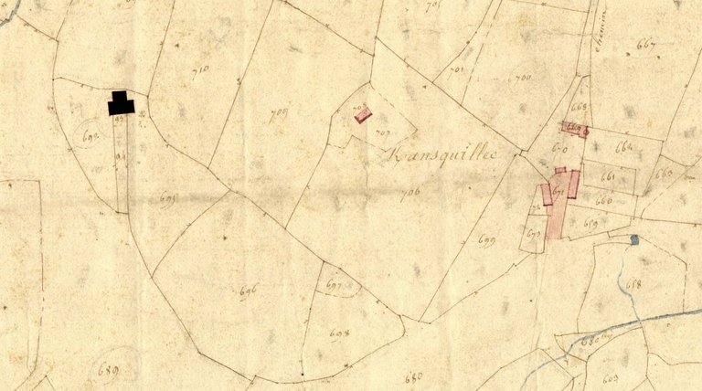Extrait de la feuille C2 du cadastre ancien de la commune de Trégrom, 1834 : manoir primitif de Keransquillec (?) (en noir) précédé d'une alléeImmatriculation